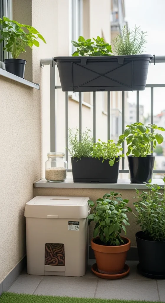 A good beginner balcony setup might be one worm bin against the wall and one plant pot nearby ready to use the compost later. This makes the cycle visible and rewarding. The scraps turn into castings, and the castings feed the plants right there.