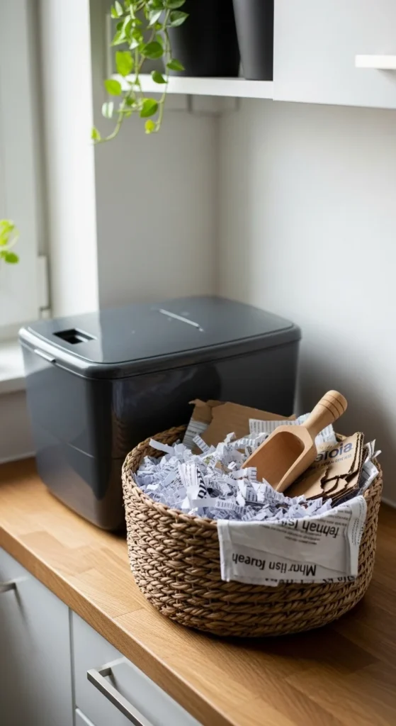 This works especially well in worm bins and compact indoor compost systems that receive lots of fruit and vegetable scraps. Tear or shred the paper into smaller pieces and store it dry until needed. The goal is to create a ready supply so every wet food addition can be balanced quickly.