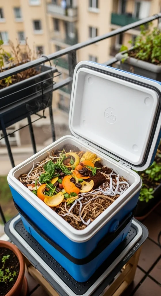This is not the easiest beginner apartment method, but it can work for people who like experimenting. An insulated cooler or sturdy lidded bin can hold small chopped batches of balanced greens and browns. Regular mixing and careful moisture control matter here. Without that, it just becomes another slow pile.