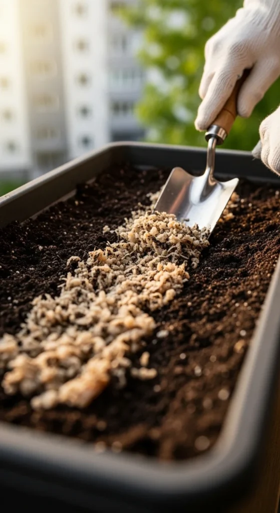 Bokashi does not end with the bucket. The fermented material usually needs a finishing stage, and balcony soil containers can provide that in apartment life. Mix the pre-composted scraps into a large planter, cover them well, and let the soil life take over.