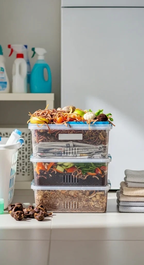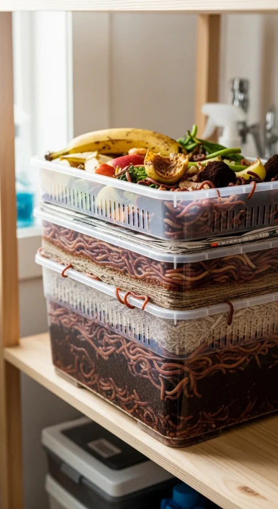 This is a strong beginner choice because the system stays small and the results are useful. A worm bin can fit under a table, in a laundry corner, or on a balcony that stays within a comfortable temperature range. The worms do best in moderate indoor conditions, not extreme heat or cold.