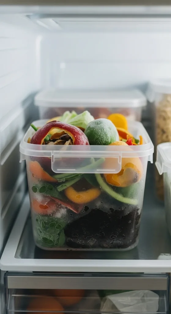 This works especially well for people who collect scraps for a worm bin, bokashi bucket, or weekly drop-off. A simple freezer-safe container or bag is enough. Once it fills, transfer the frozen scraps to the compost method of choice. The scraps thaw and break down as usual later.