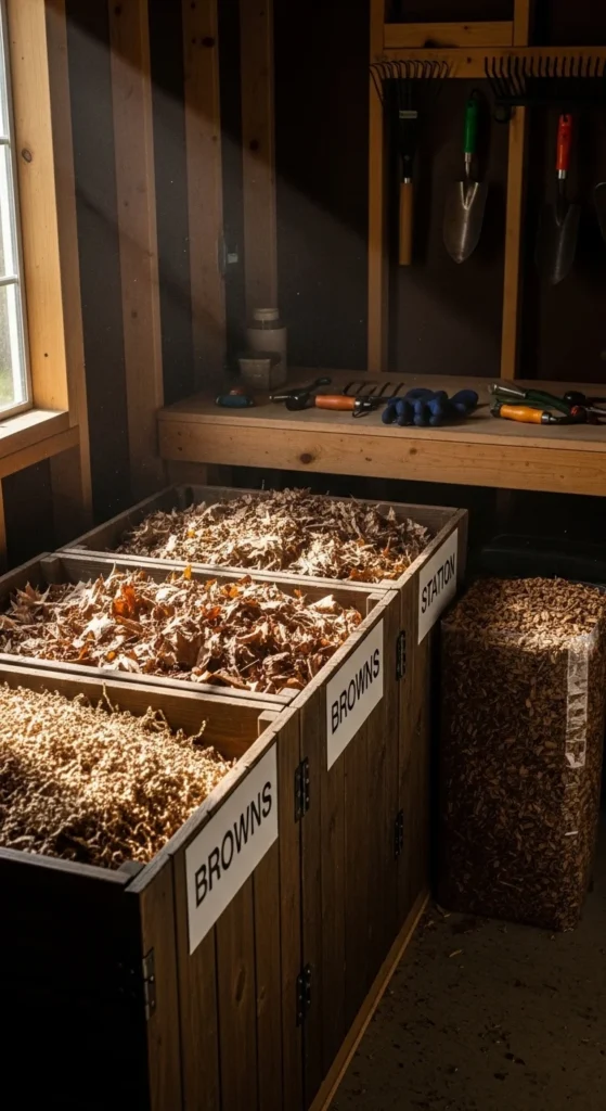 - Make browns easy: shred cardboard and store it dry in a tote.