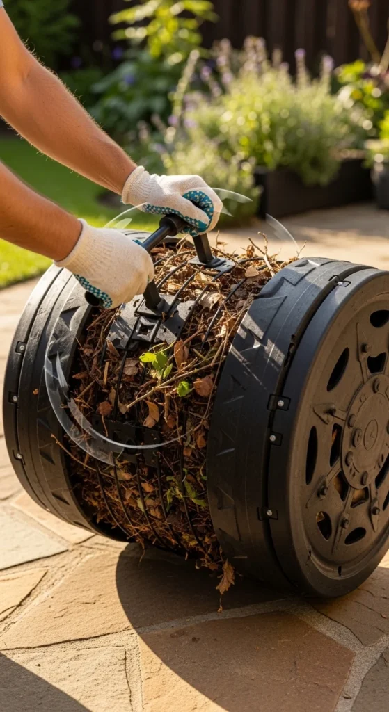 If the tumbler gets slimy, add dry leaves and spin. If it stalls, add a handful of grass clippings and a bit of water, then spin again.