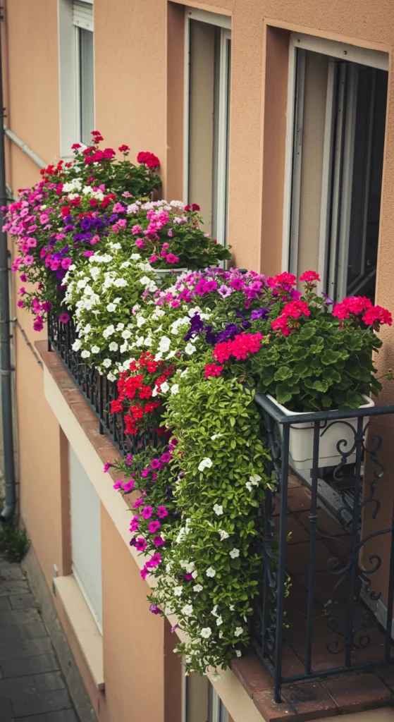 Choose a color palette and stick with it for a bold impact. For example, mix purple petunias, lavender, and pink begonias. Group pots together for a cohesive look. A simple theme makes the balcony look organized and stylish, even with limited plants.