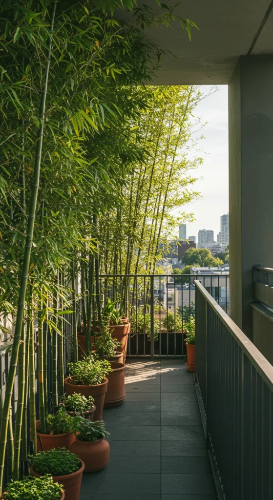 Bamboo grows fast and provides privacy. Place it in tall pots along the railing. It acts as a natural screen while adding a tropical vibe. Choose clumping bamboo varieties to prevent spreading.