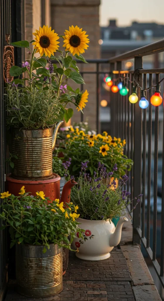 Turn old items into planters. Use tin cans, teapots, or baskets. Drill drainage holes and paint them for style. This sustainable practice saves money and adds personality to your balcony.