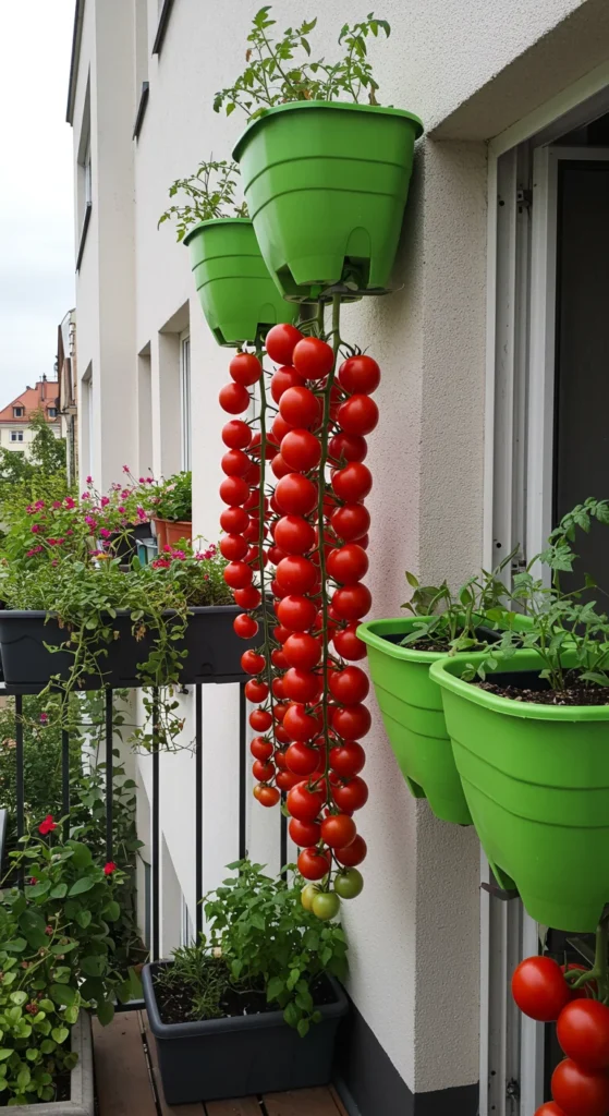 Grow tomatoes upside down with hanging planters. This saves floor space and reduces pest problems. Small cherry tomato varieties work best. Water consistently, and you’ll enjoy balcony-grown produce.