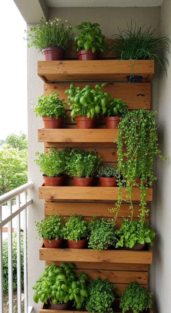 Stack shelves to expand growing space. Small balconies benefit from vertical shelving filled with herbs and flowers. Choose lightweight pots for safety. Shelves also make watering and maintenance easier.