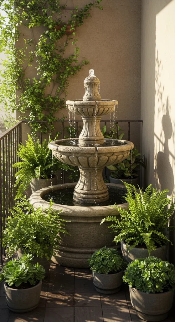 Add a calming touch with a tabletop fountain or small water bowl. Surround it with leafy plants for a serene corner. Water features also help create a cool, relaxing environment.