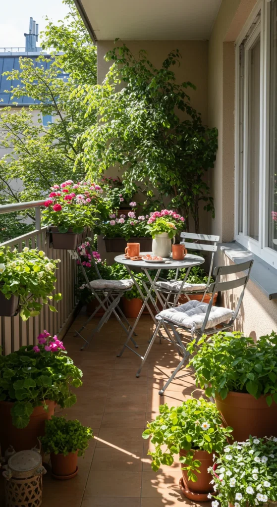Combine seating with greenery for the ultimate balcony garden. Use foldable furniture to save space. Surround the area with colorful flowers and herbs. It turns the balcony into an inviting spot for meals, reading, or conversations.