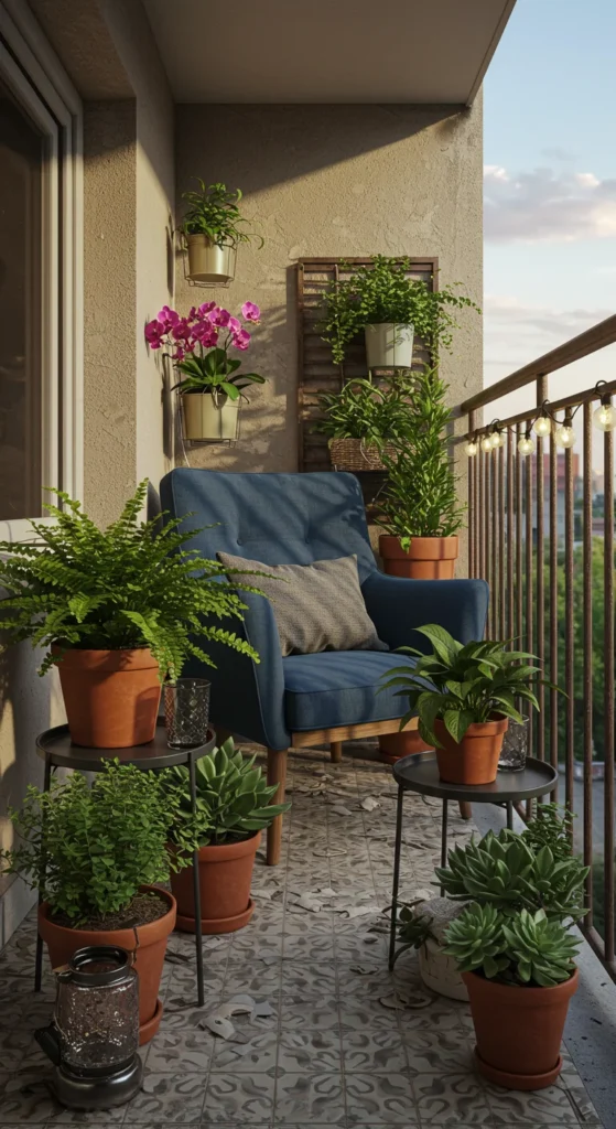 Dedicate one corner to comfort and greenery. Place a chair or small bench surrounded by floor pots filled with leafy plants. Add a tiny side table for your morning coffee. It creates a peaceful escape without overwhelming the balcony. Use tall plants like bamboo or palms at the back and smaller flowering pots at the front.