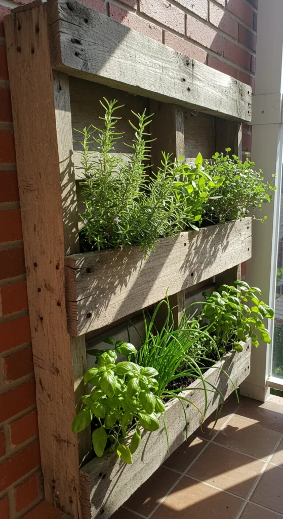 Vertical gardens are perfect for small balconies. Build a simple frame with shelves or hang fabric planters against the wall. Fill with herbs, small succulents, or cascading greenery. It saves space while making a bold visual impact. This is a great DIY project using recycled pallets. Paint the frame in colors that match your balcony for a personal touch.