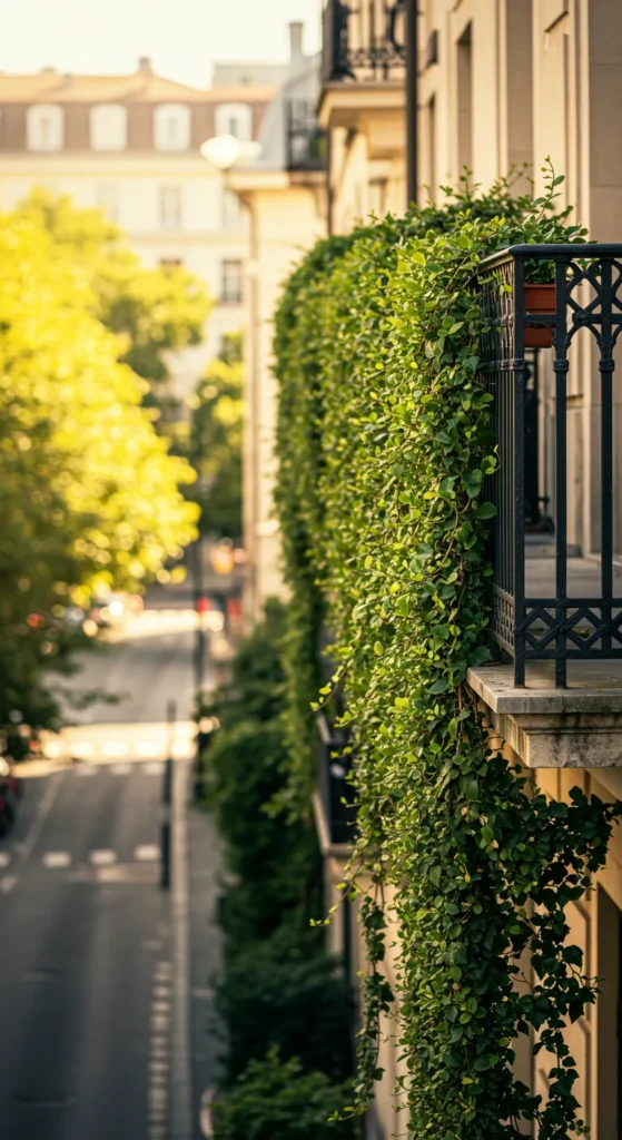 Ivy and trailing vines soften hard balcony lines. Plant them in railing planters or wall-mounted pots. Over time, they create a curtain of green that adds privacy. Choose hardy varieties like English ivy or pothos for easy care. Water consistently to encourage steady growth.