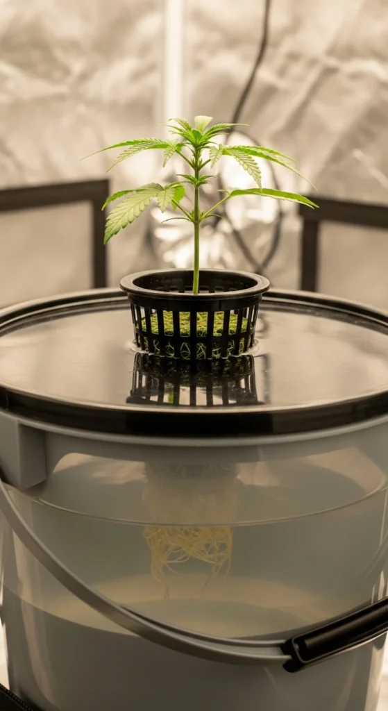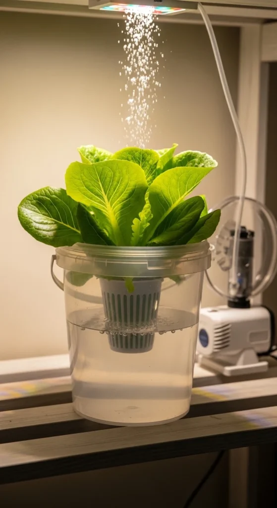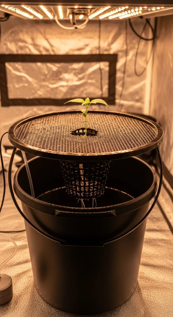 Fill the bucket with nutrient solution. Add an air stone connected to a small air pump. The bubbling keeps roots oxygenated.