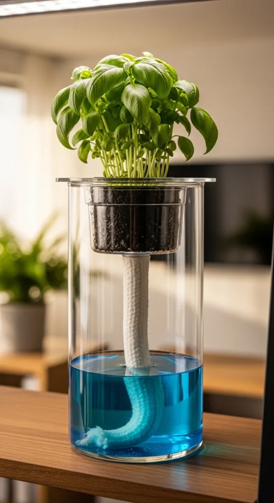 A wick system uses cotton rope to draw solution upward into growing medium.