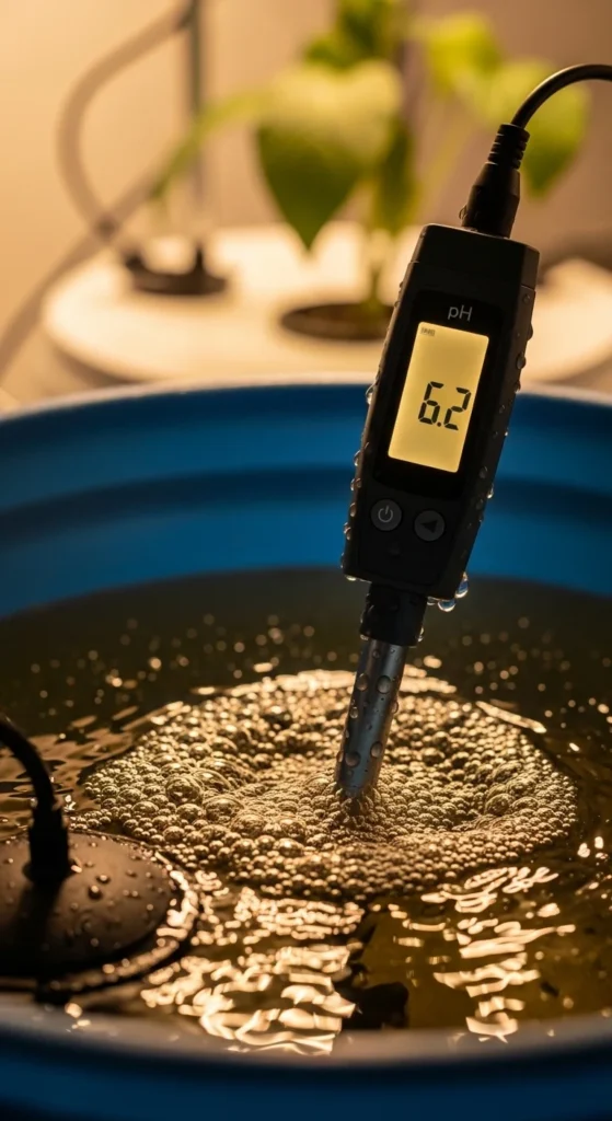 Hydro plants absorb nutrients best between pH 5.5–6.5. Outside this range, nutrient lockout can happen.