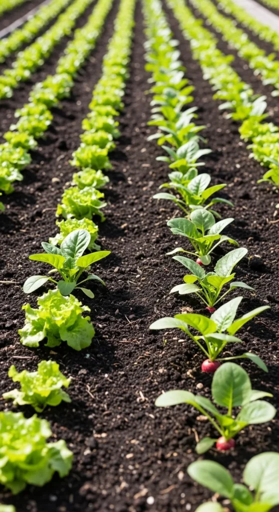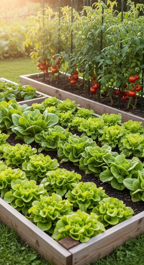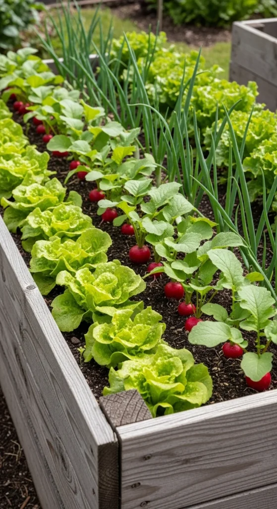 [Image Prompt: Raised bed filled with lettuce, radishes, and green onions growing evenly, bright daylight, ultra-realistic DSLR image, no text]