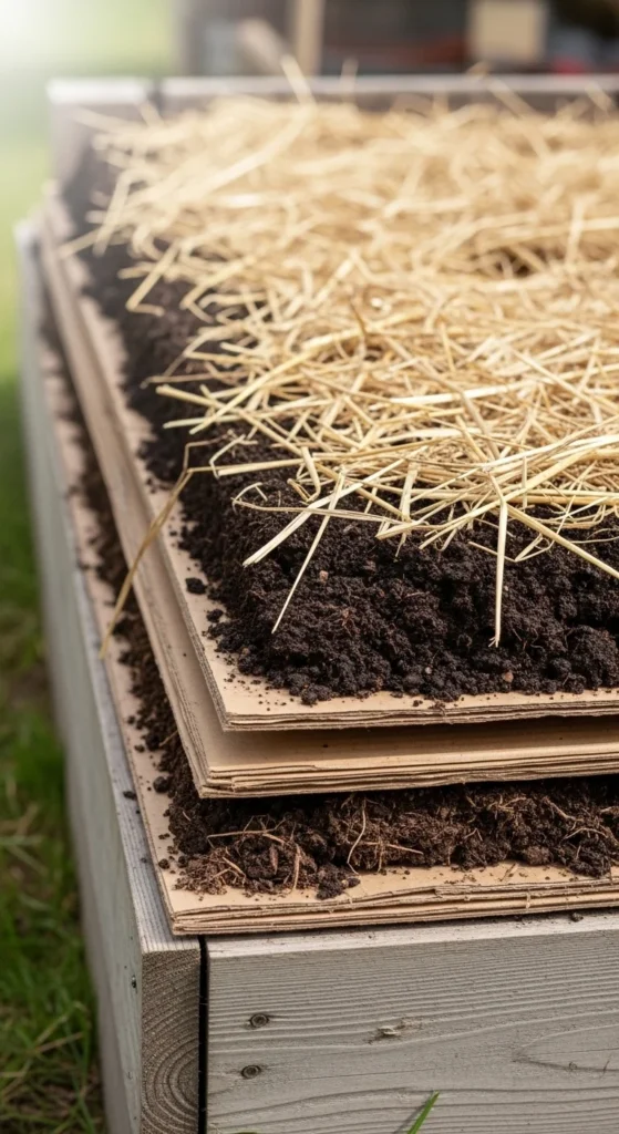 Lay cardboard directly on grass to block weeds. Add compost and mulch on top.