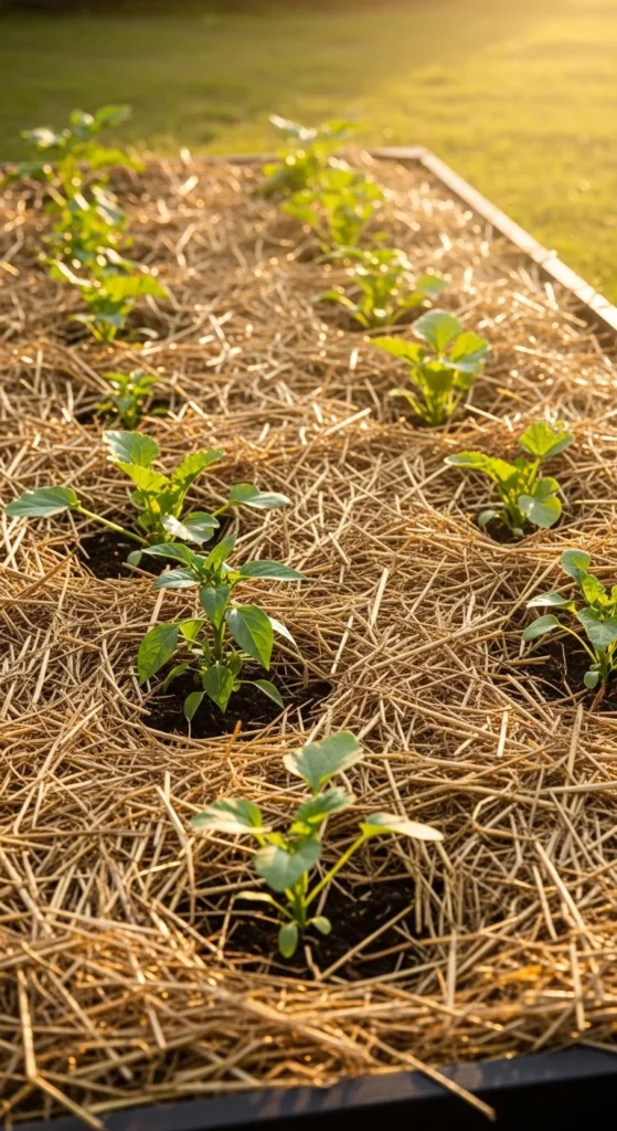Spread straw, shredded leaves, or grass clippings 2–3 inches thick.