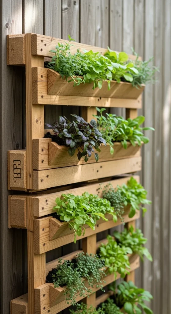 Stack pallets vertically to create wall-mounted raised beds. Fill each slot with soil and small plants. This saves ground space and is excellent for small yards. Secure the pallets to a wall or fence for safety. It’s cheap, space-saving, and visually appealing. Perfect for herbs, strawberries, or leafy greens.