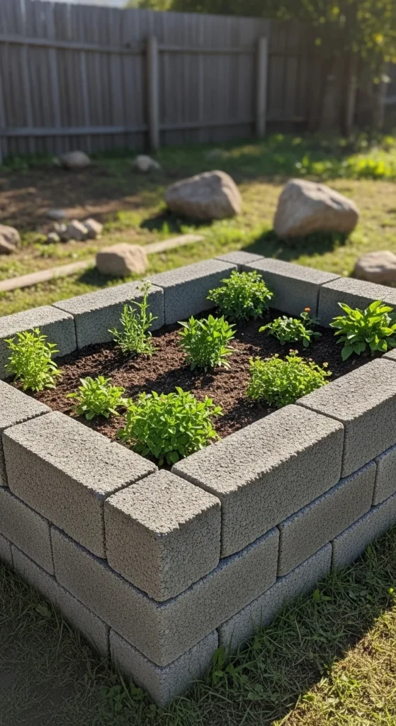 Concrete blocks alone make a cheap, sturdy raised bed. Stack to the desired height and fill with soil. Paint or leave natural for a minimalist look. Blocks are often available at low cost from hardware stores. This method requires minimal tools and can be expanded over time.