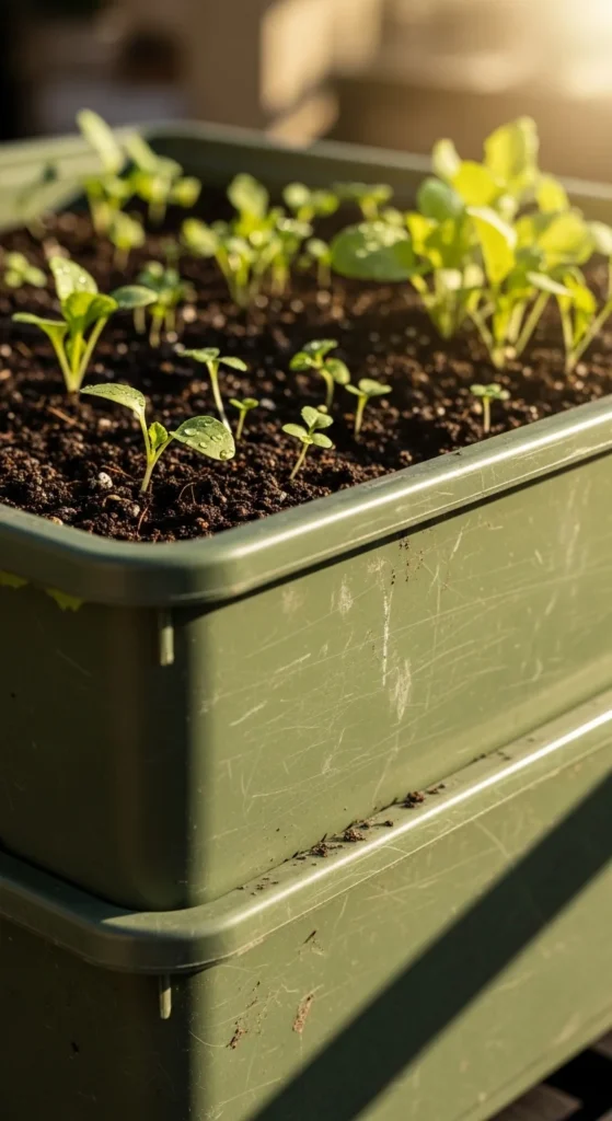 Large plastic bins or totes can become inexpensive raised beds. Drill drainage holes at the bottom, fill with soil, and plant. This works for small patios or balconies. Plastic is lightweight, reusable, and easy to move. You can even stack shallow bins for a multi-level planting setup.