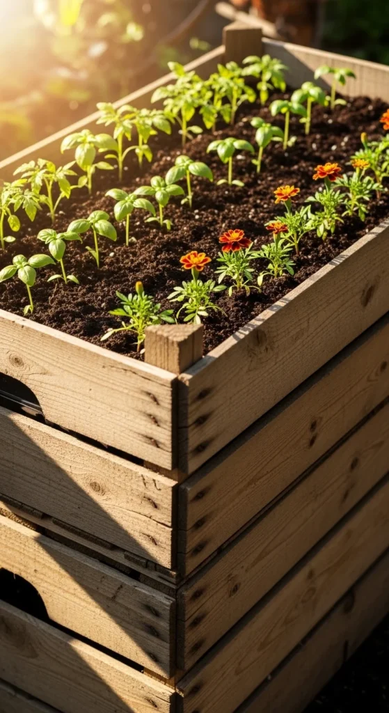 Old fruit or shipping crates can be stacked to create modular raised beds. Line them with landscaping fabric to retain soil. You can expand the system over time as your garden grows. Crates are often free from grocery stores or markets. Stack carefully to avoid tipping. A stackable crate bed is perfect for small spaces or a DIY vertical garden.