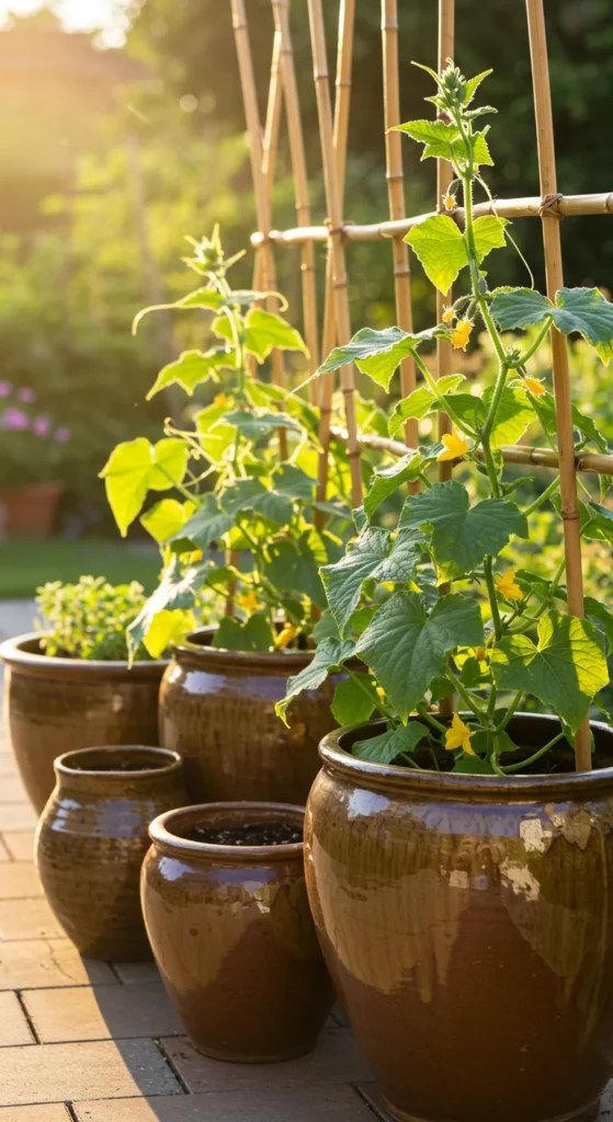 Cucumbers love climbing. Place a trellis inside a large pot and let the vines grow upward. This keeps the fruit clean and saves ground space. Trellised pots work well on balconies and patios, turning a vertical wall into a productive garden spot.