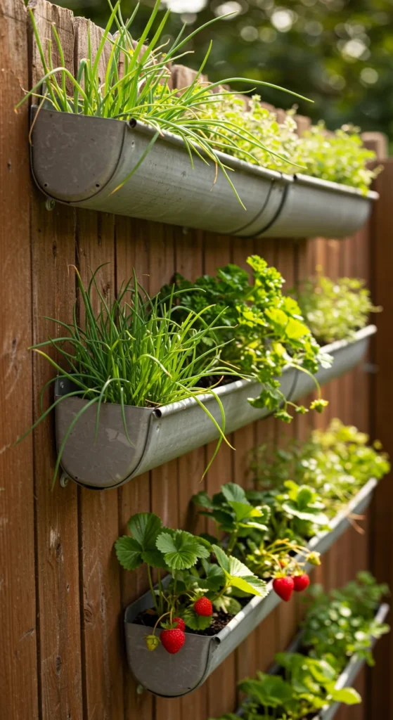 Old gutters can be mounted on walls or fences for shallow-rooted crops. Drill drainage holes and fill with soil. Plant herbs, strawberries, or lettuce in these slim planters. It’s a clever way to use vertical space without taking up any floor area.