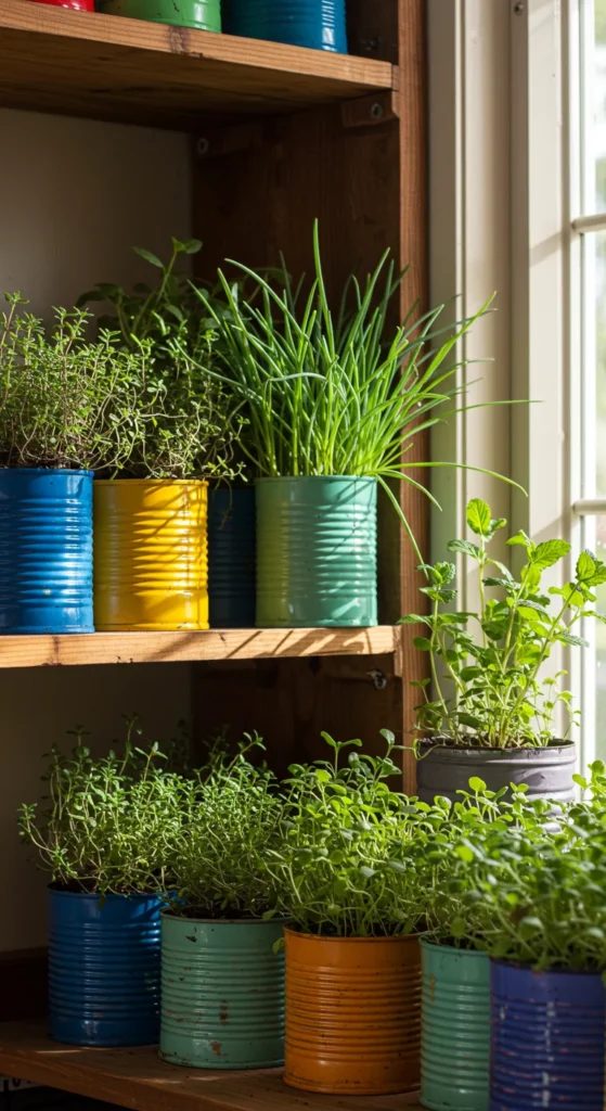 Don’t throw away tin cans—repurpose them as mini herb planters. Drill drainage holes, paint them for decoration, and fill with soil. These cans are perfect for small herbs and add character to windowsills or shelves.