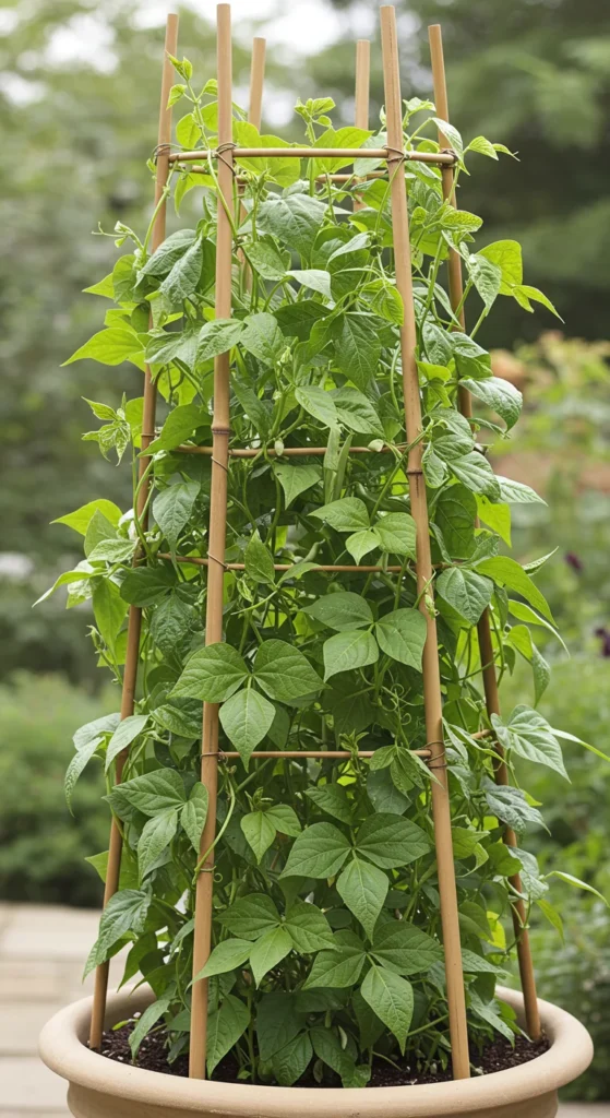 Beans thrive in tall pots with supports. Add bamboo poles or a small teepee structure for climbing varieties. Tall containers save ground space and make it easier to harvest beans without bending over.