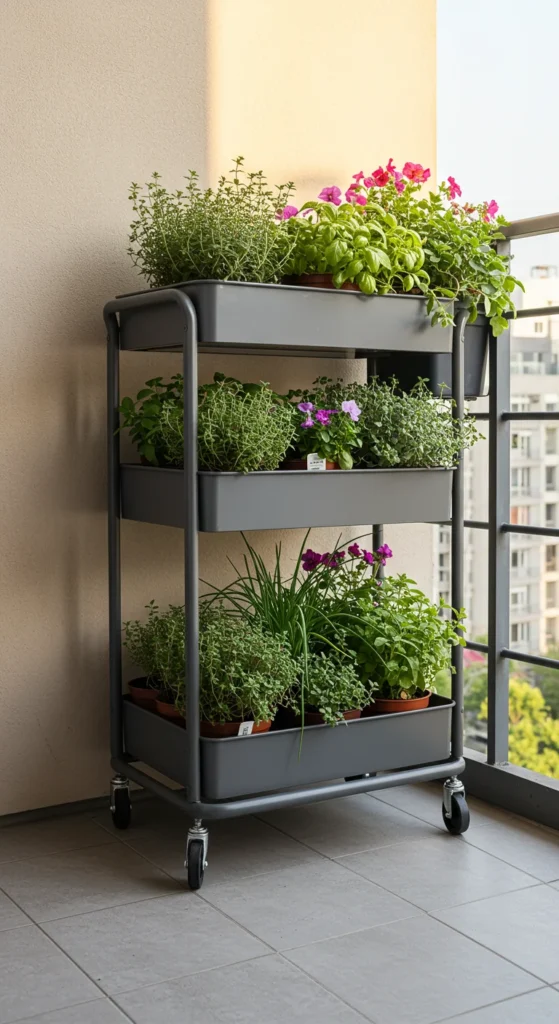 A rolling cart makes a mobile garden. Place potted herbs and greens on each shelf and wheel it around to catch the sun. Perfect for renters or anyone who likes rearranging their plants. It keeps everything neat and compact.