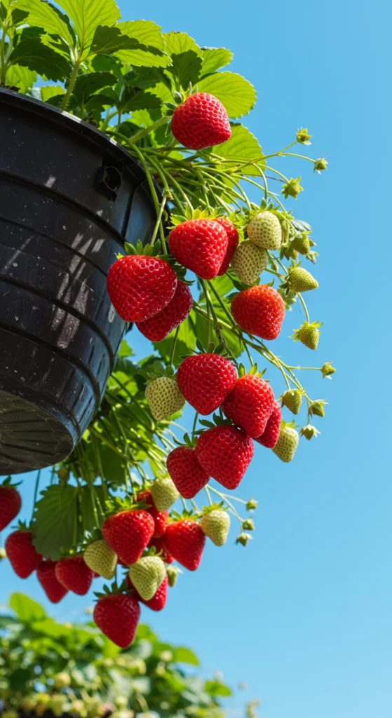 Strawberries thrive in hanging baskets. Their trailing vines naturally spill over the edges, making harvesting easy. Hang baskets on a balcony, porch, or garden hook to save floor space. Use lightweight potting mix and water regularly since hanging baskets dry out quickly. This setup not only saves room but also doubles as a beautiful display of greenery and red berries.