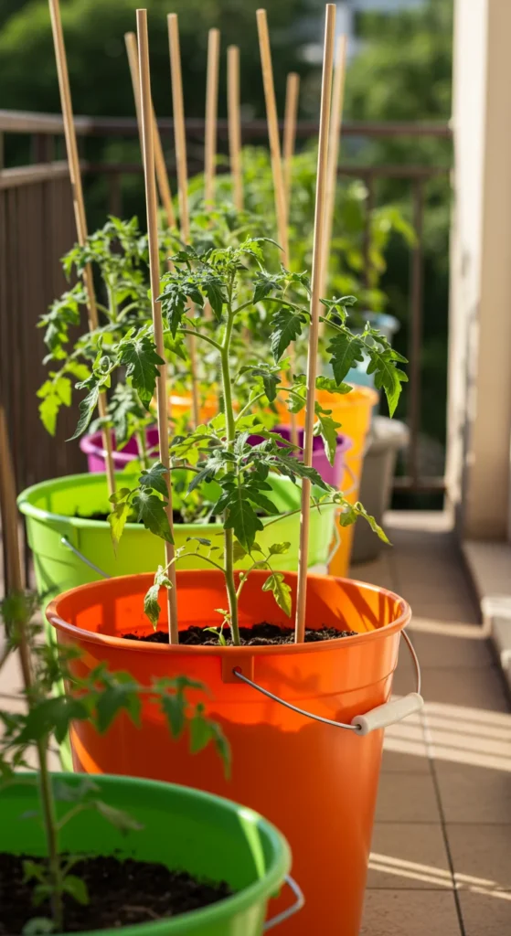 Tomatoes adapt well to buckets. Drill drainage holes, fill with quality potting mix, and add a sturdy stake or cage. Buckets are cheap, portable, and hold enough soil for large crops. Place them in full sun and water regularly. For an extra tip, bury the stem deep when planting to encourage stronger roots.