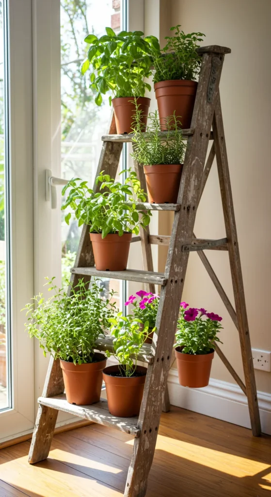 Turn an old ladder into a tiered garden. Place potted plants on each step to maximize vertical space. Herbs, succulents, and flowers work beautifully in this setup. It’s a creative way to display many plants in a small footprint. Plus, ladders add charm and height variation to your container garden.