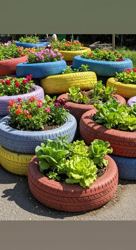 Recycled tires can be repurposed into colorful planters. Paint them with non-toxic paint for added charm. Fill with soil and grow flowers, greens, or even root vegetables. Stack tires for deeper containers or keep them single for shallow crops. This is an eco-friendly way to upcycle while saving money.