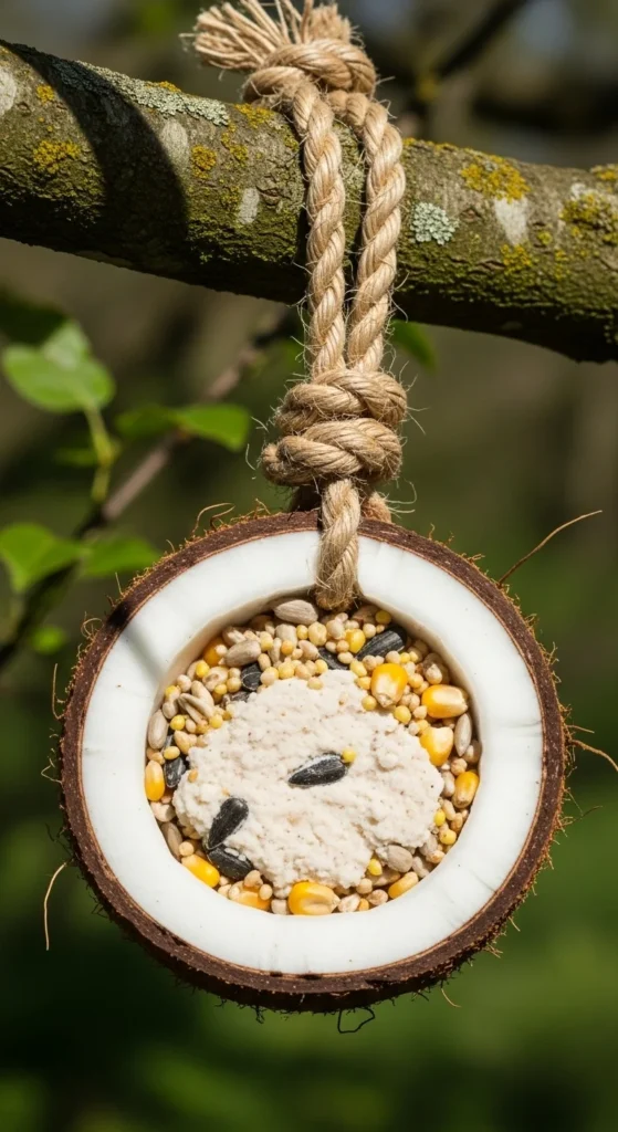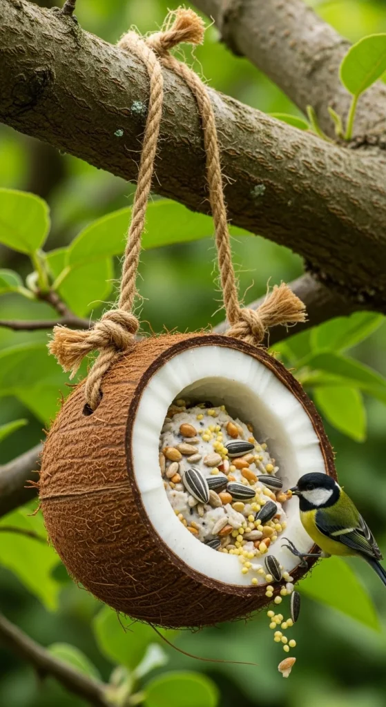 Cut a coconut in half, scoop out the flesh, and drill small holes for hanging rope. Fill it with suet or seed mix. It’s natural, biodegradable, and durable through the seasons.
