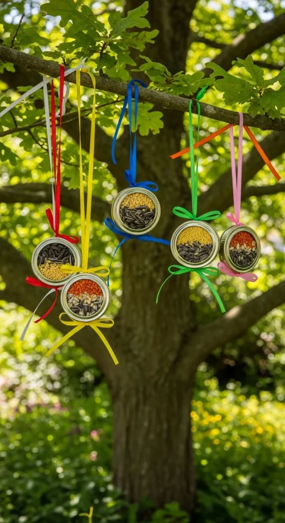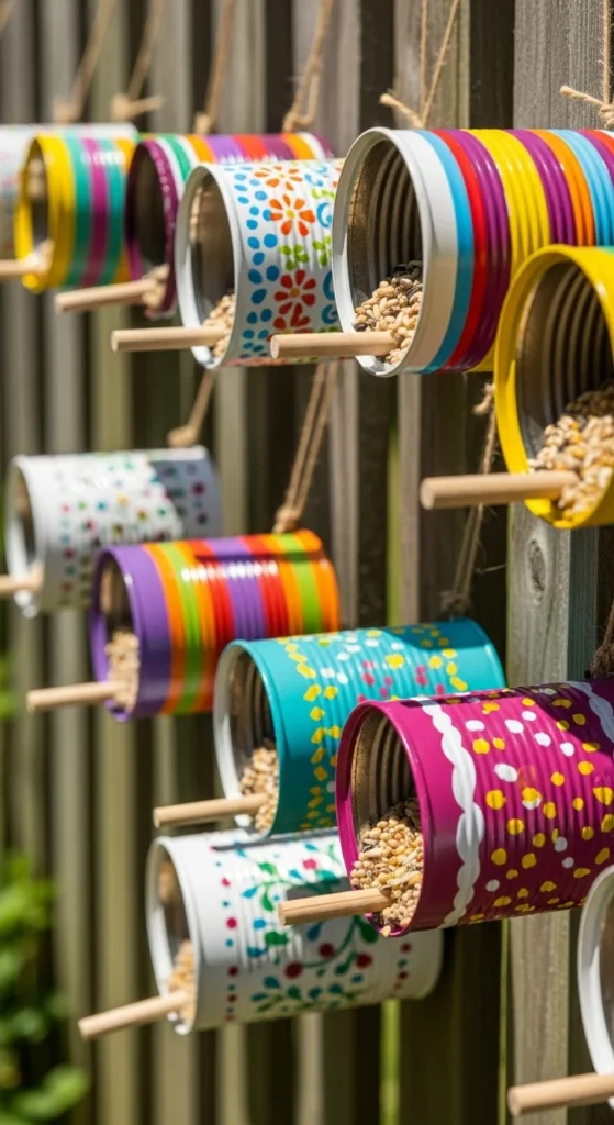 Clean and paint tin cans in bright colors. Add a wooden dowel across the opening as a perch. Hang them horizontally using twine. They’re cheerful, easy to refill, and add pops of color to fences or trees.