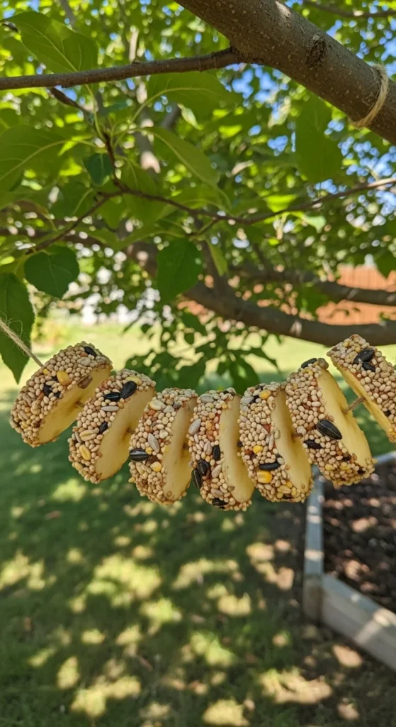 Slice apples crosswise and coat them with peanut butter and seed. String them up through the center holes. Birds will enjoy pecking both the fruit and the seeds—a double treat.