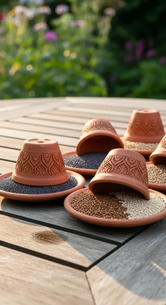 Flip small terra cotta pots upside down and glue them to saucers. Fill the saucers with seed. You can paint the pots or leave them natural for a rustic garden look.