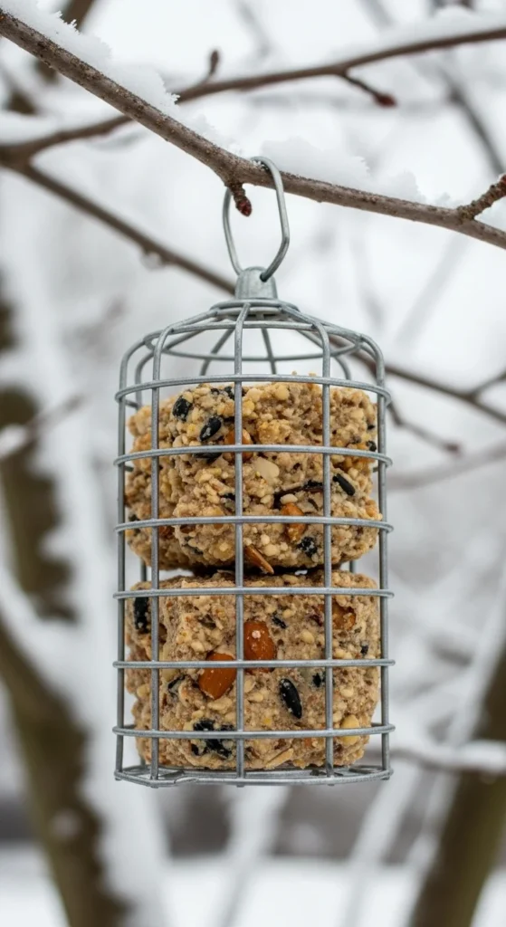 Mix birdseed with melted fat or lard, pour into molds, and let set. Hang the suet cakes in mesh bags or wire cages. This high-energy food helps birds stay warm through cold months.