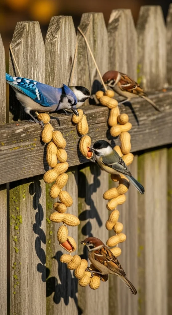 Thread whole peanuts through heavy twine or wire to make a garland. Hang it between branches or along railings. It attracts woodpeckers, jays, and chickadees.
