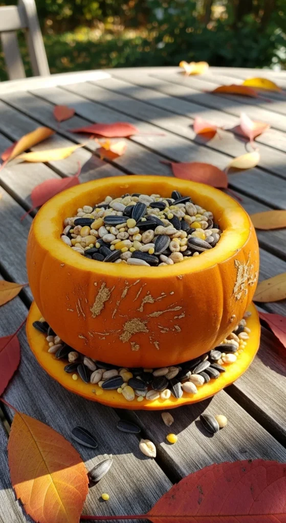 After carving pumpkins, save a few halves as natural feeders. Scoop out the seeds, fill with bird food, and place them on the ground or a table. Perfect for fall and biodegradable when done.
