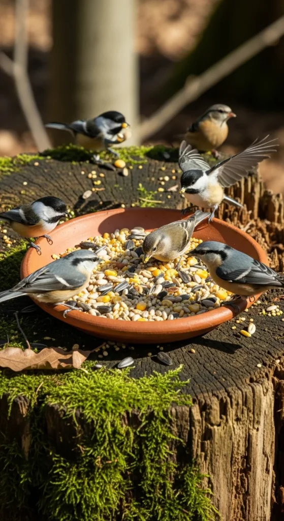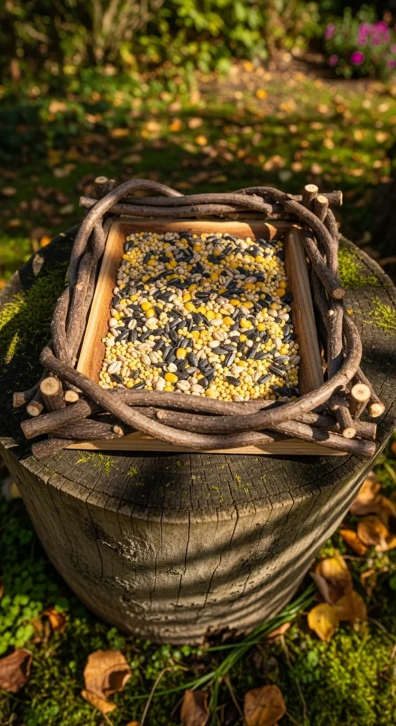 Build a simple tray using twigs or scrap wood. Place it on a stump or raised post. This open design invites multiple birds at once and fits naturally into your garden landscape.
