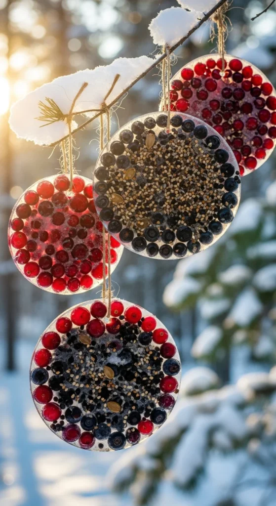 Mix seeds and cranberries into water, pour into a mold, and freeze. Hang the discs outdoors on cold days. They look stunning in sunlight and feed birds naturally in winter.