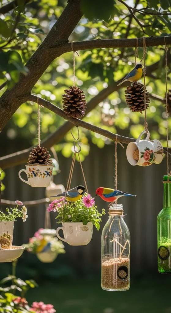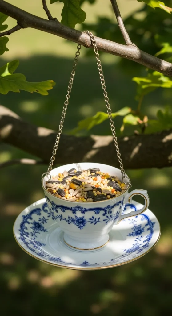 Turn old teacups into elegant feeders. Glue the cup sideways onto the saucer and attach a chain to hang it. Fill the saucer with seed. It’s dainty, decorative, and makes a charming gift for garden lovers.