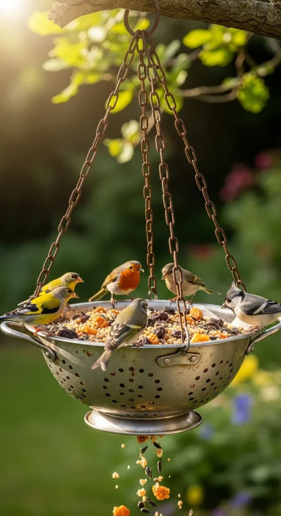 Repurpose an old colander as a feeder. The holes allow water to drain while holding seeds. Hang it under a porch or tree for protection from rain.