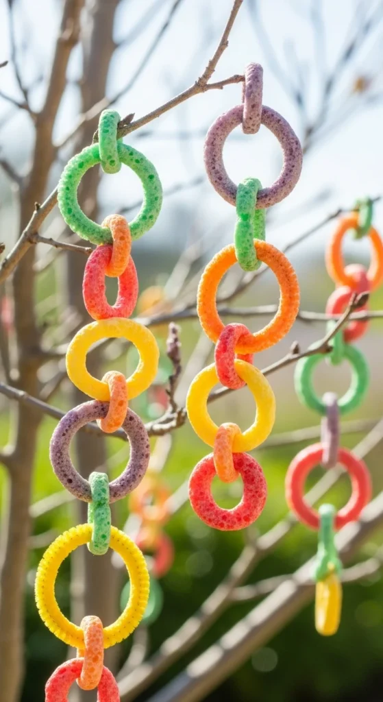 String cereal rings like Cheerios onto pipe cleaners, twist the ends together, and hang them outdoors. A fun, edible craft that’s great for kids and backyard wildlife alike.