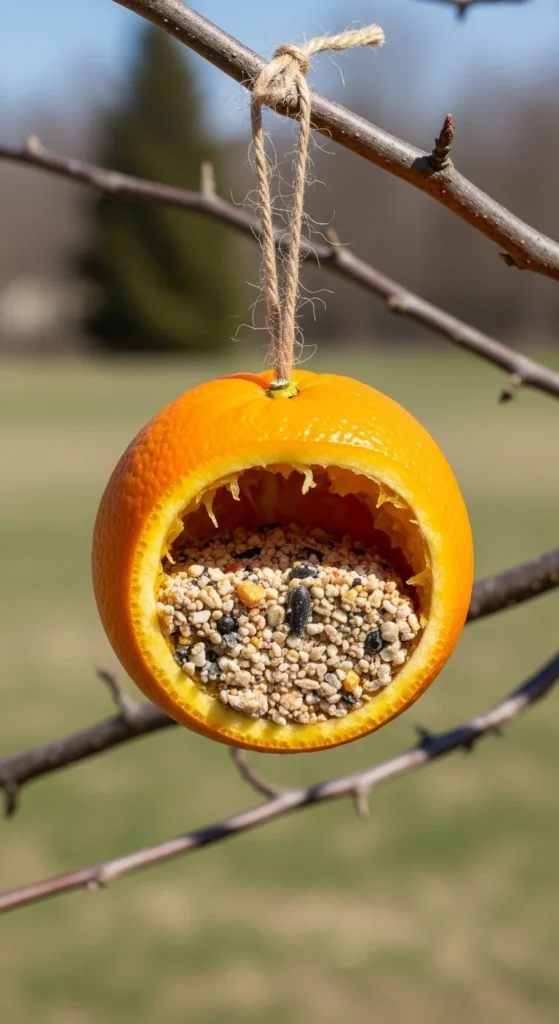 Use orange halves as natural bowls. Scoop out the fruit, poke holes for string, and fill with seed. The bright color attracts birds while giving them a vitamin-rich treat if bits of fruit remain.